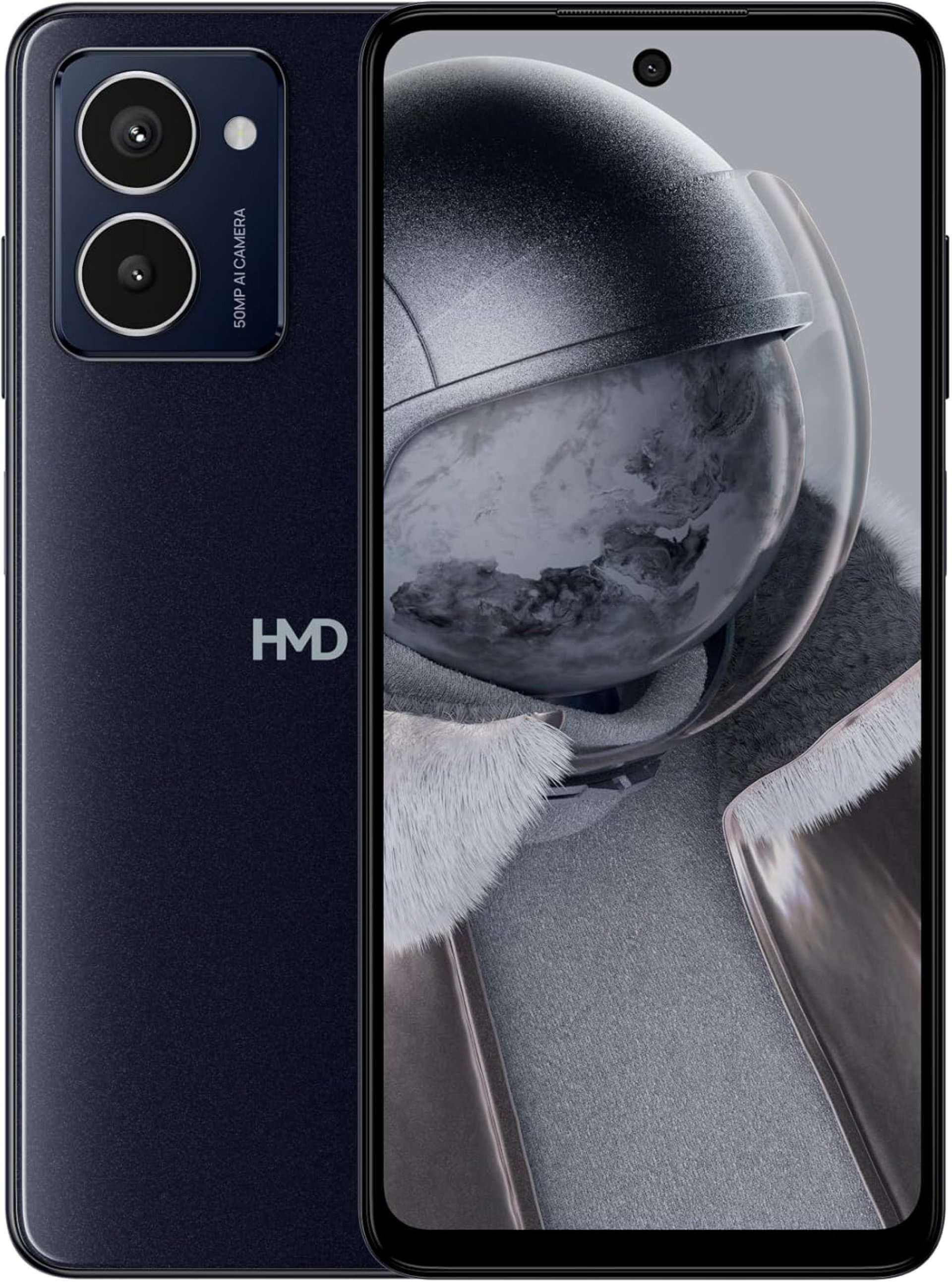The phone boasts a dual rear camera setup with a 50 MP main sensor and depth sensor for portrait effects, while the 50 MP front camera captures detailed selfies and supports features like AI HDR and night modes.